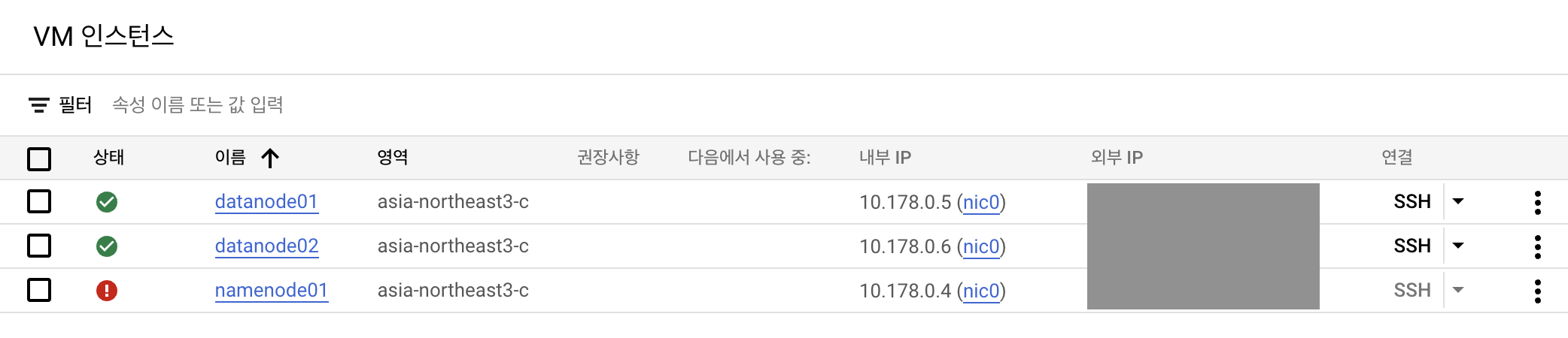 VM 인스턴스의 목록을 보니, 크래킹으로 인해 암호화폐 체굴에 사용되던 namenode 인스턴스가 다운되어 있습니다. 이런 빅 데이터 솔루션들의 클러스터 구성을 진행할 때, '/etc/hosts'에 통신할 모든 서버의 ip를 기재하고 있으므로 하나의 인스턴스가 해킹 당하면 모든 인스턴스가 차례로 해킹 당하는 결과가 생깁니다.