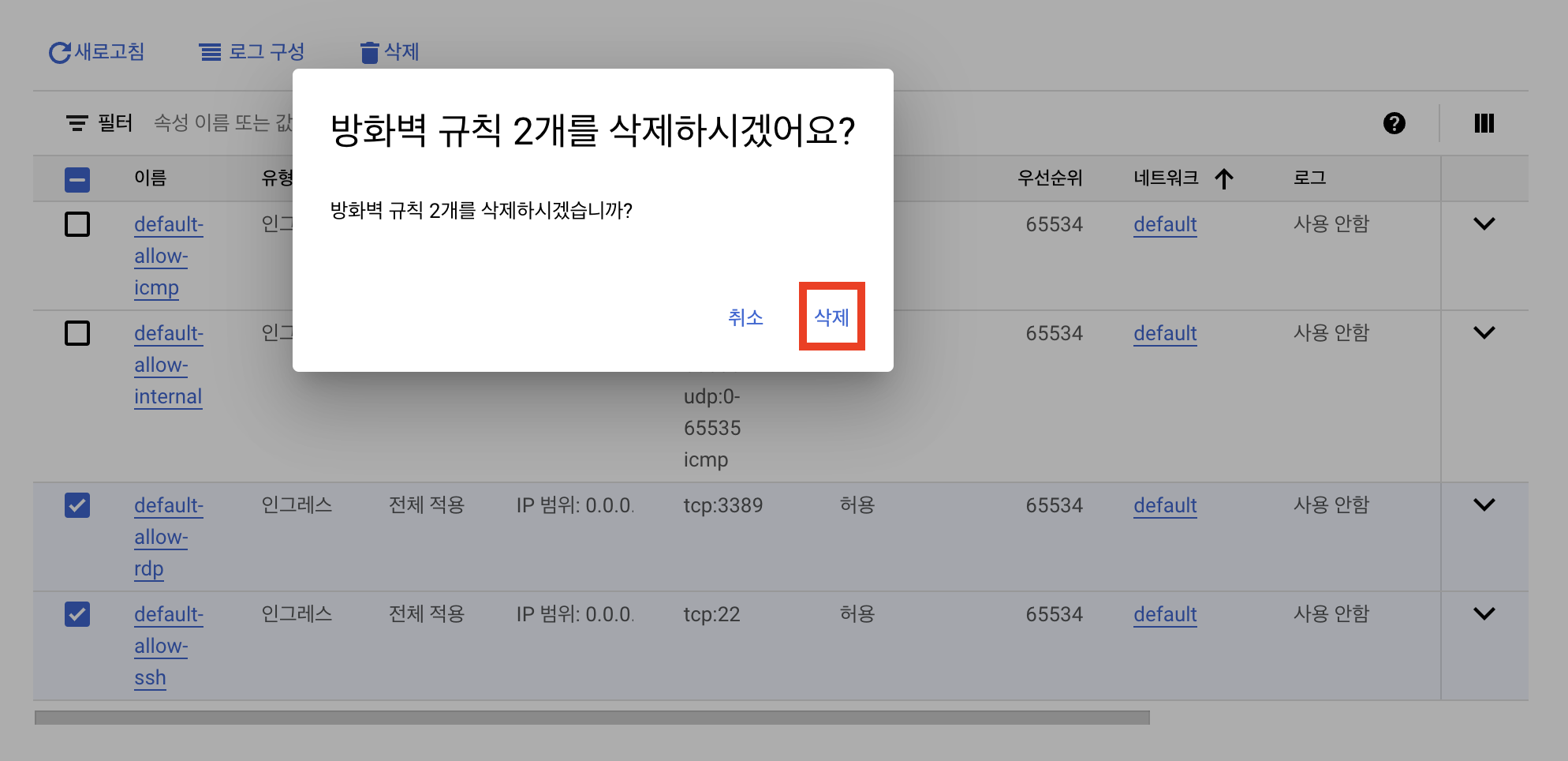 방화벽 규칙 삭제하기: SSH 및 RDP 전역 통신 허용
