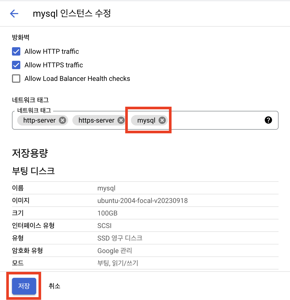 방화벽 구성 바로 아래 부분에 ‘네트워크 태그’라는 항목이 있습니다. 해당 부분에 이미 ‘http-server’, ‘https-server’라는 이름의 태그들이 생성되어 있군요. 해당 태그들 옆에 앞으로 사용할 이름의 태그를 입력해주시면 됩니다. 저는 임의로 ‘mysql’이라는 태그를 붙였습니다.