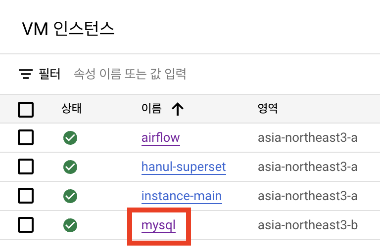 대시보드에서 ‘VM 인스턴스’ 항목으로 들어가신 다음, 태그를 붙일 인스턴스를 클릭합니다. 저는 mysql 인스턴스에 대하여 ‘전역 통신을 허용하는 방화벽’을 구성하는 실습을 해 보도록 하겠습니다.