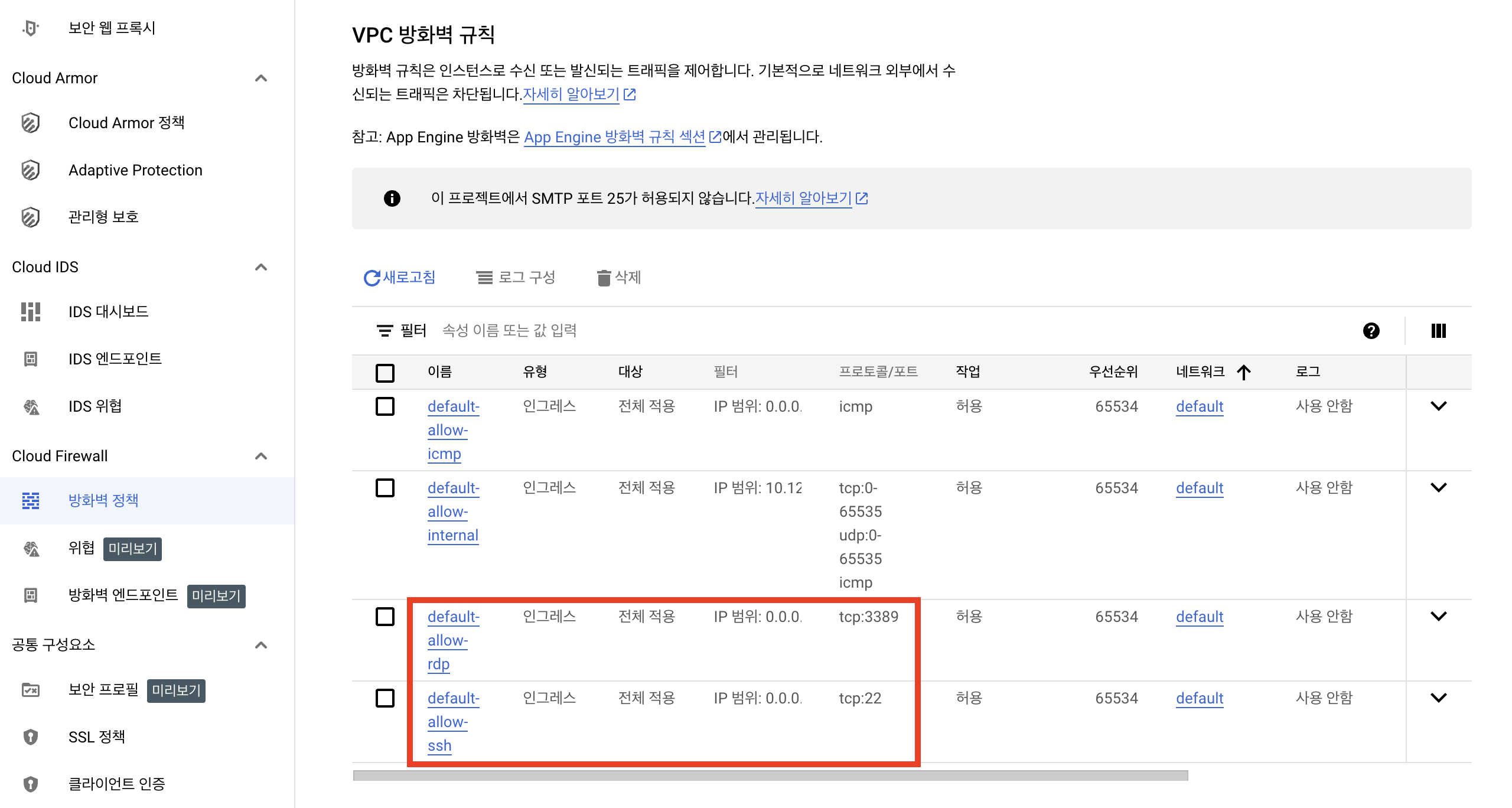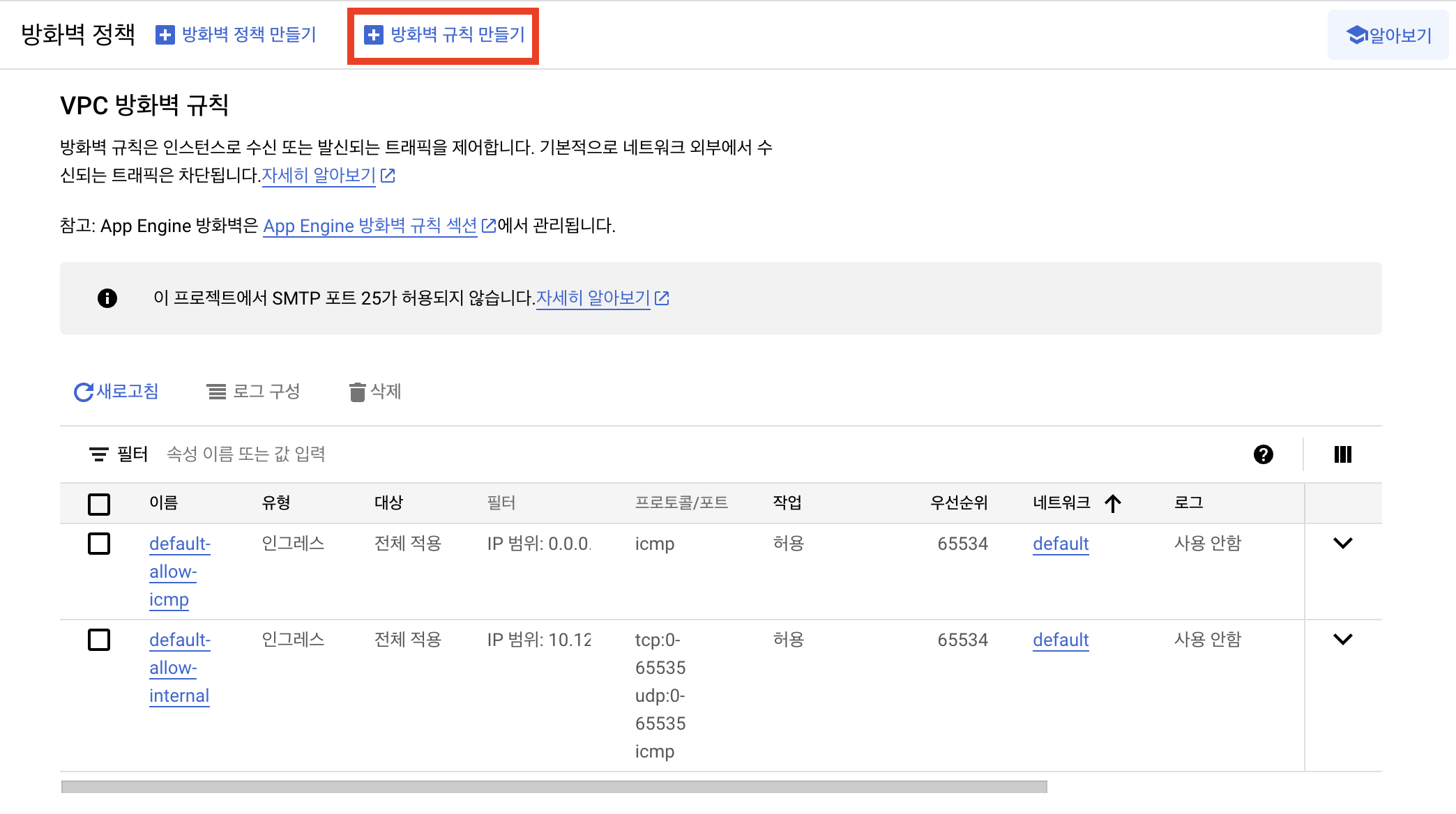 GCP 방화벽에는 기본 설정으로 아래 2개의 방화벽 규칙이 디폴트로 사전 생성되어 있습니다.