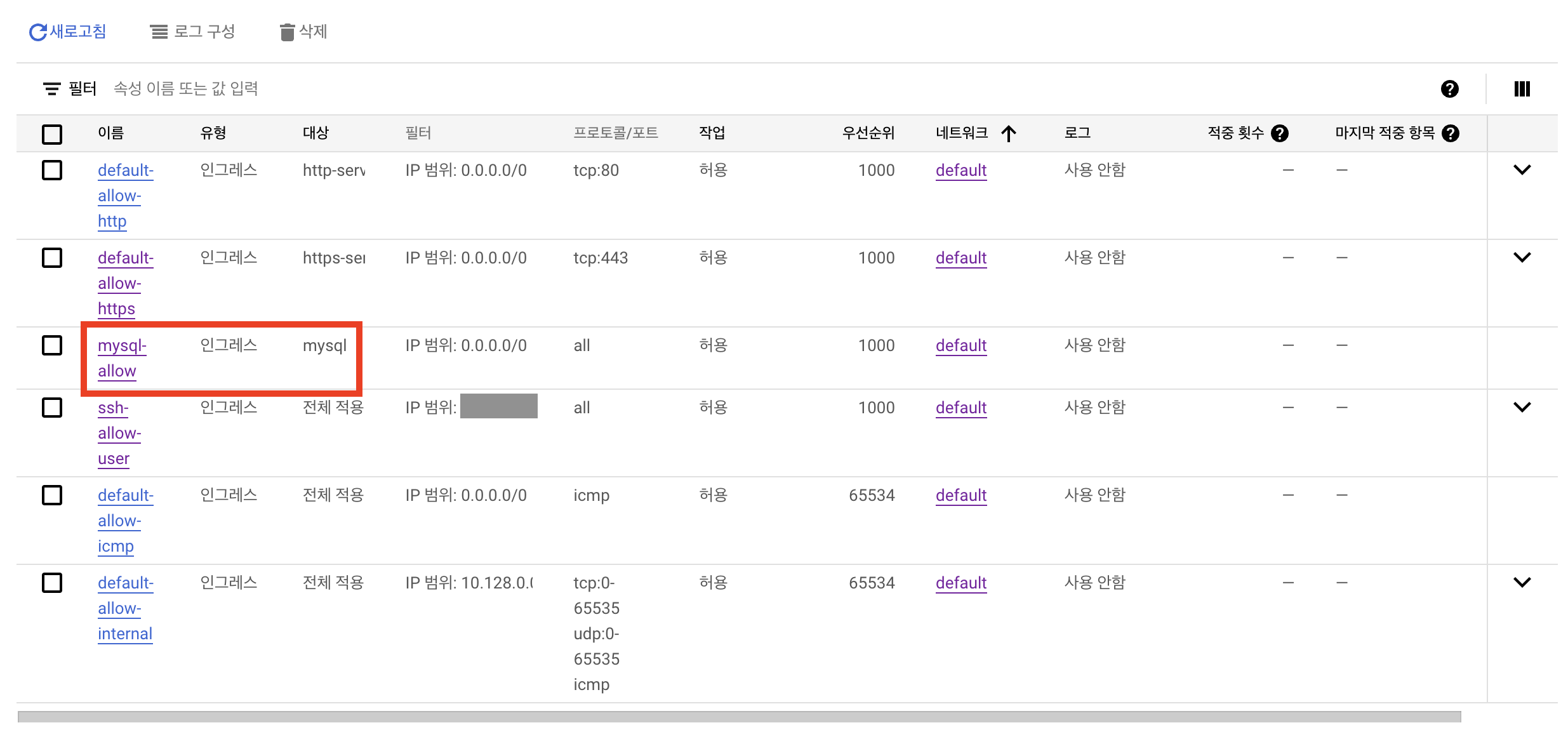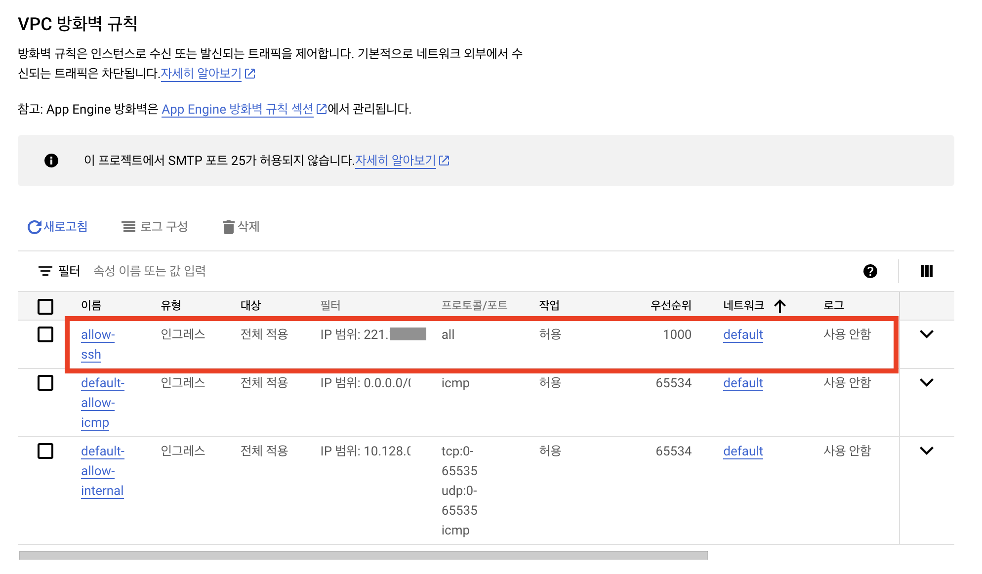 - default-allow-ssh: 계정 내 모든 인스턴스에 **ip 전역(0.0.0.0/0)**에서의 22번 포트 접근 허용