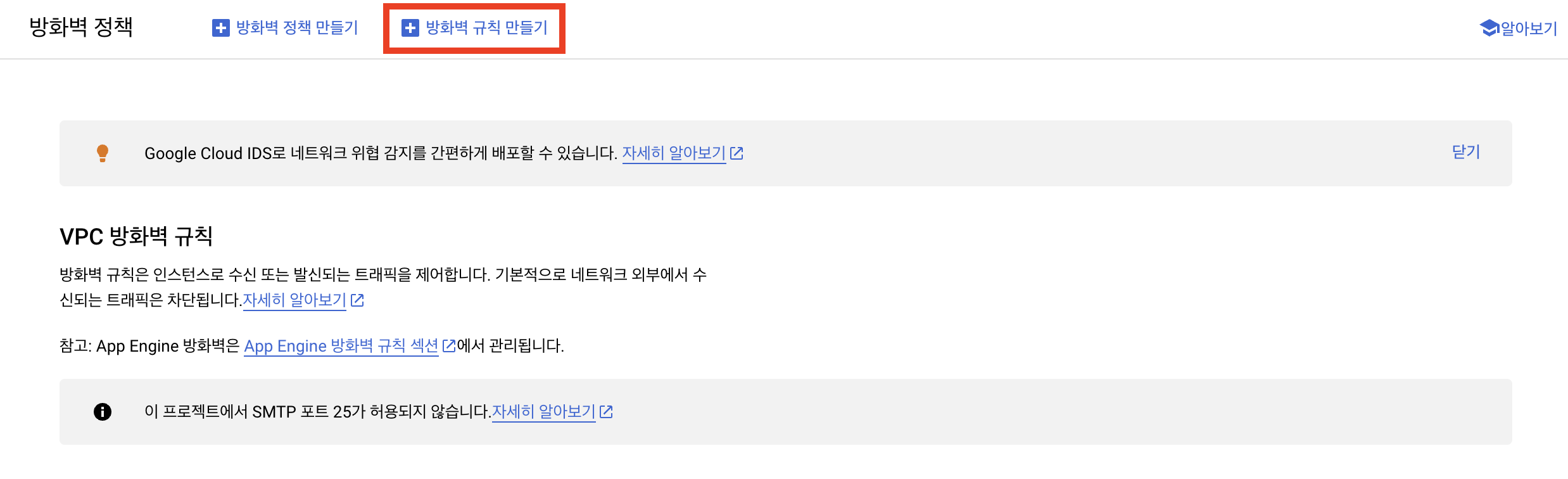 좌측 메뉴바 → VPC 네트워크 → 방화벽