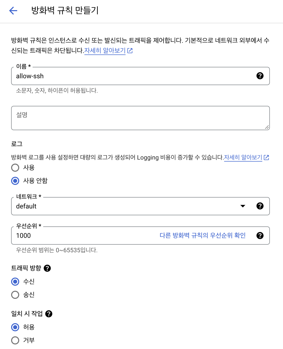 방화벽 규칙의 이름은 원하는 이름으로 지정하시면 됩니다(저는 다용도로 사용할 목적이나 주로 ssh 통신 숑으로 사용할 예정이므로 allow-ssh로 만들었습니다). 외부에서의 인스턴스 ‘접속’을 ‘허용’할 목적임으로 트래픽 방향은 ‘수신’으로, 일치 시 작업 여부는 ‘허용’으로 만들어주세요.
