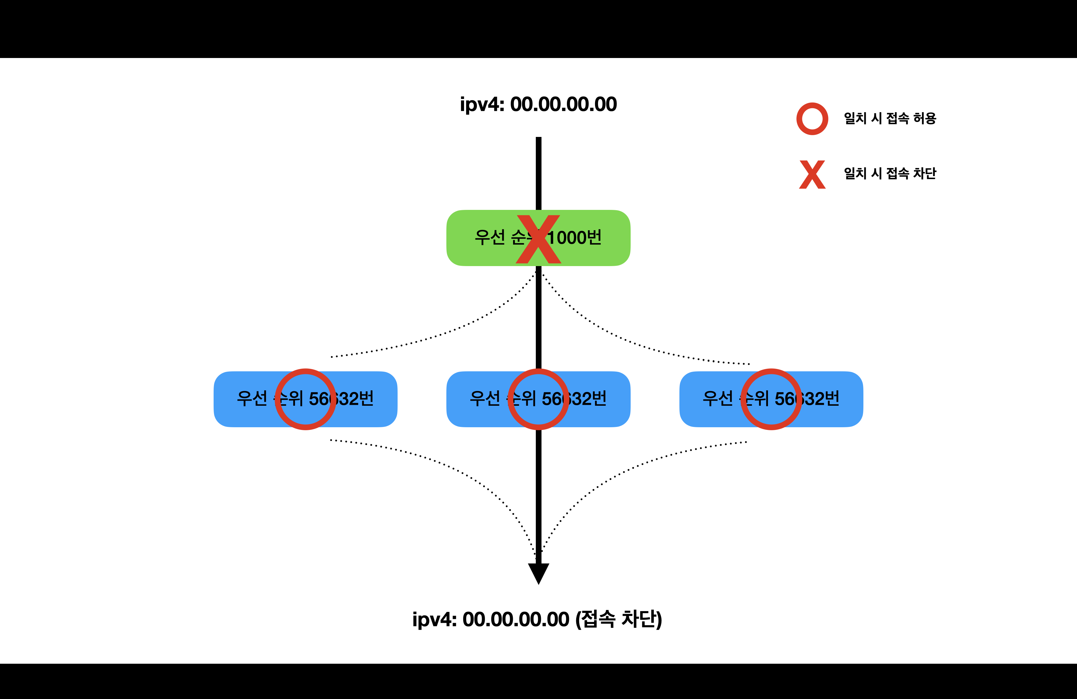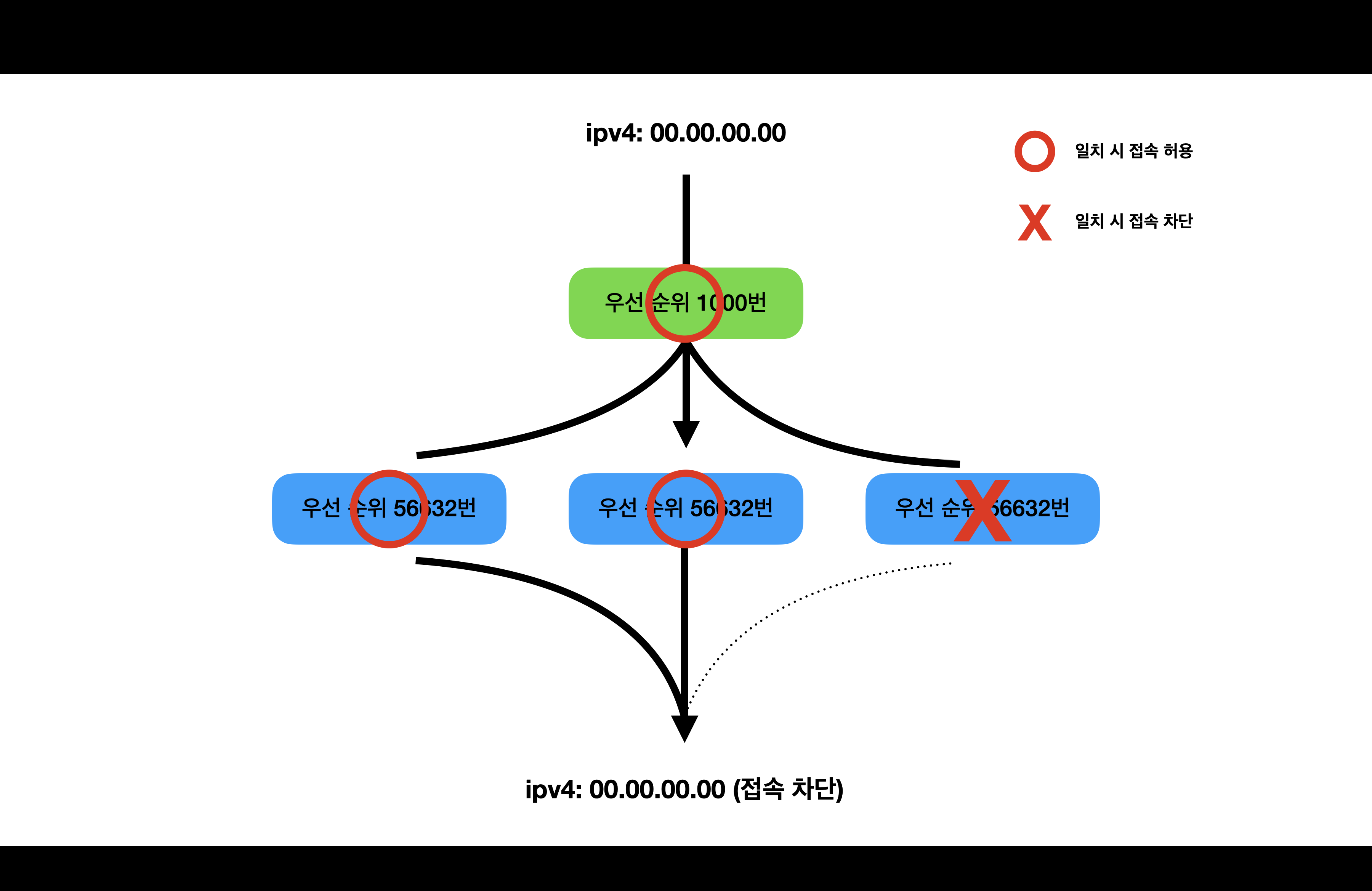 외부 ip 00.00.00.00 번에서 접속을 시도하려고 합니다. 현재 낮은 우선순위의 방화벽 3개중 2개는 ‘조건 일치 시 접속 허용(allow)’ 방화벽이지만, 나머지 하나는 ‘조건 일치 시 접속 차단(deny)’ 방화벽입니다. 00.00.00.00 번은 모든 방화벽의 조건에 일치하므로 최종적으로 접속이 차단되었습니다.