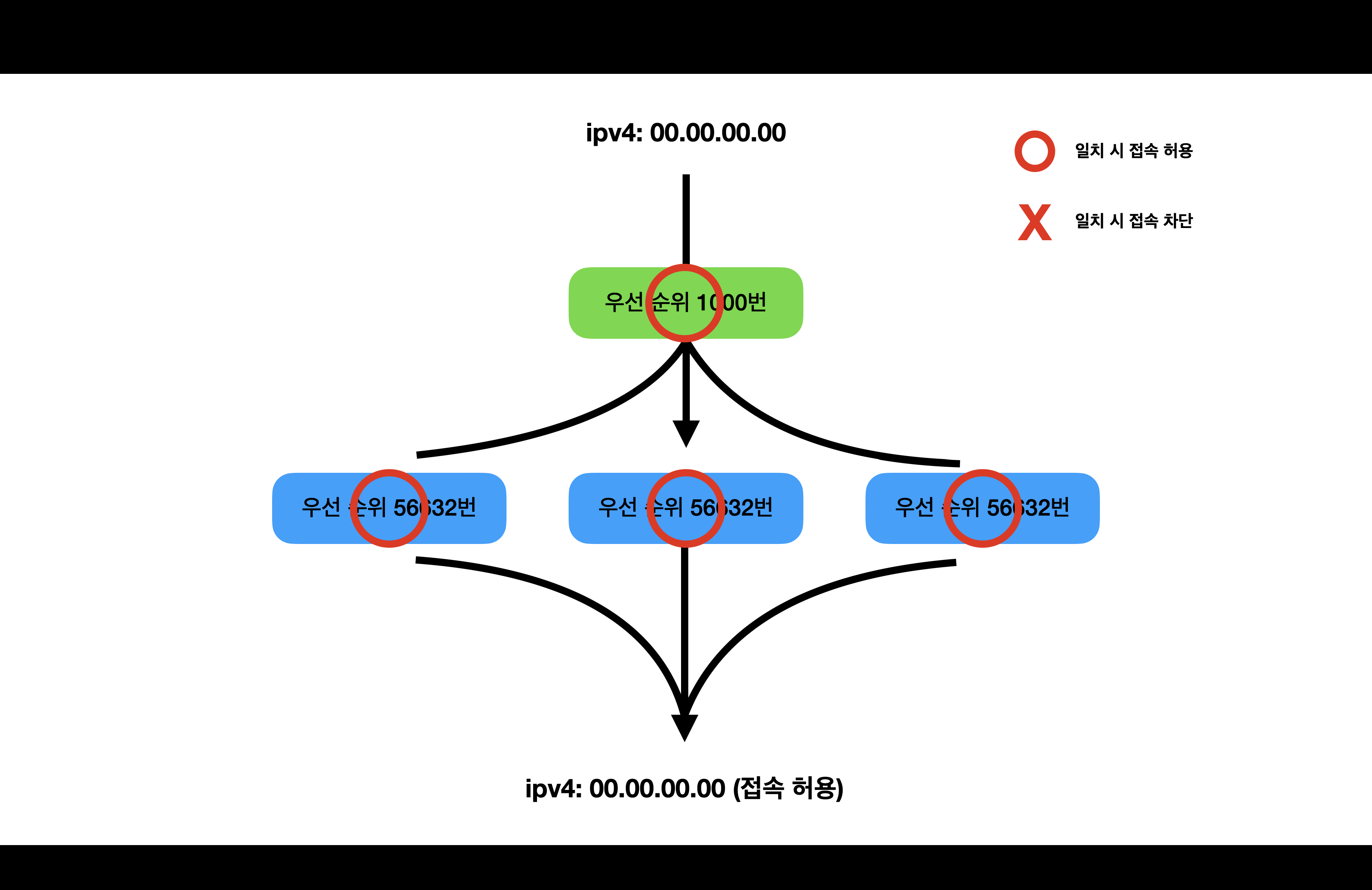 외부 ip 00.00.00.00 번에서 접속을 시도하려고 합니다. 현재 모든 방화벽들은 ‘조건 일치 시 접속 허용(allow)’ 방화벽들입니다. 00.00.00.00 번은 모든 방화벽의 조건에 일치하여 최종적으로 접속이 허용되었습니다.