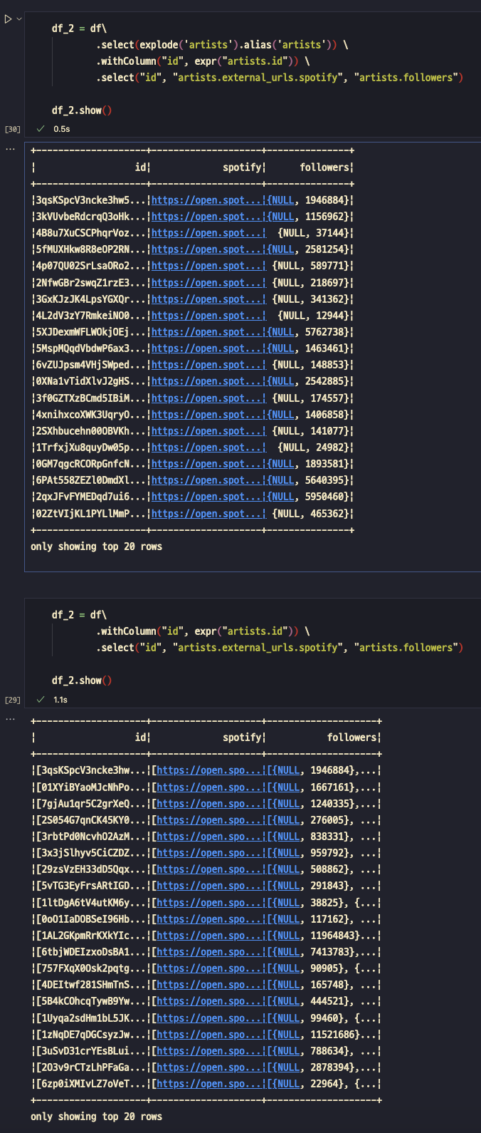 # 컬럼 선정하기 : artists(array 타입), external_urls(struct 타입)