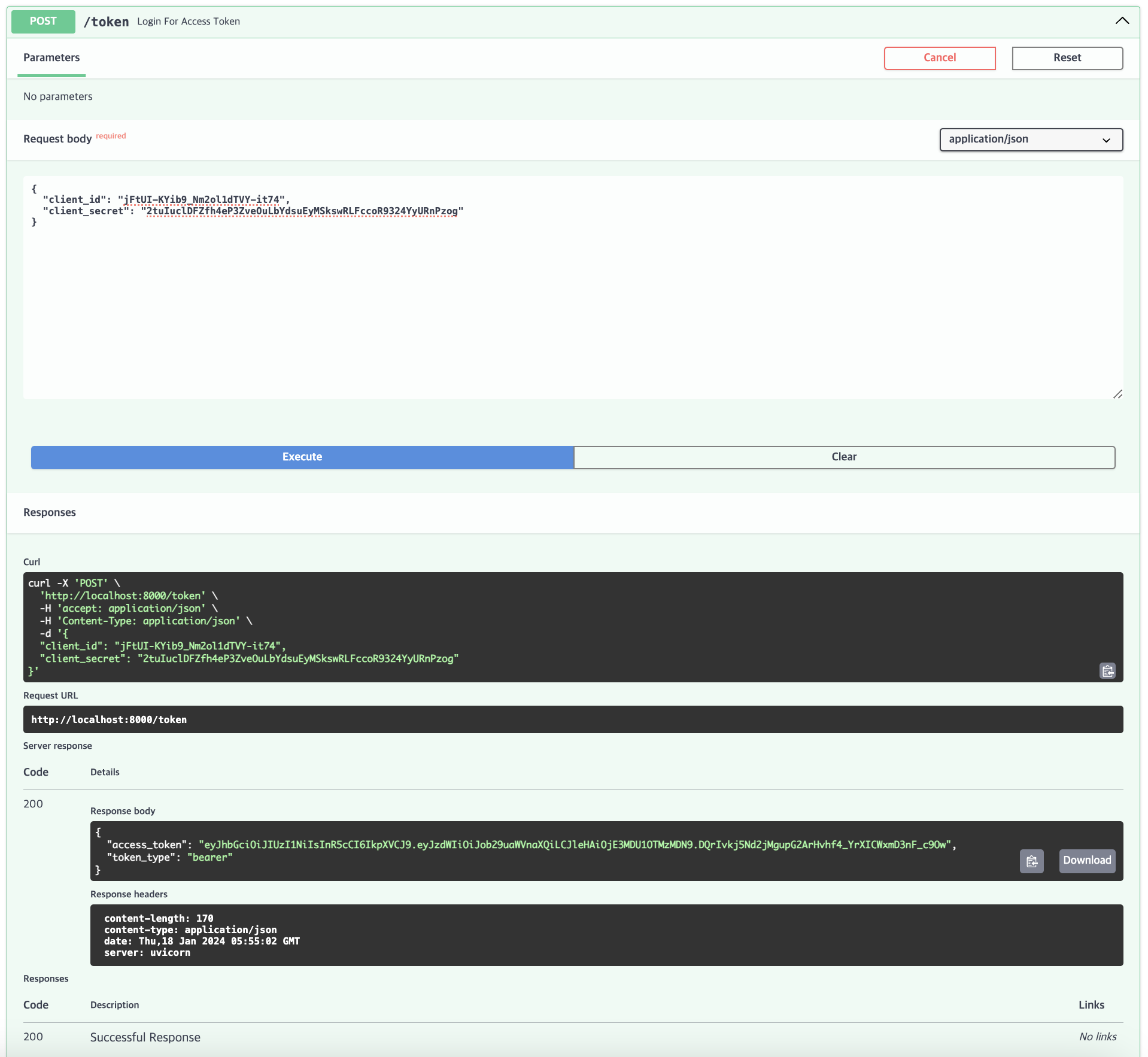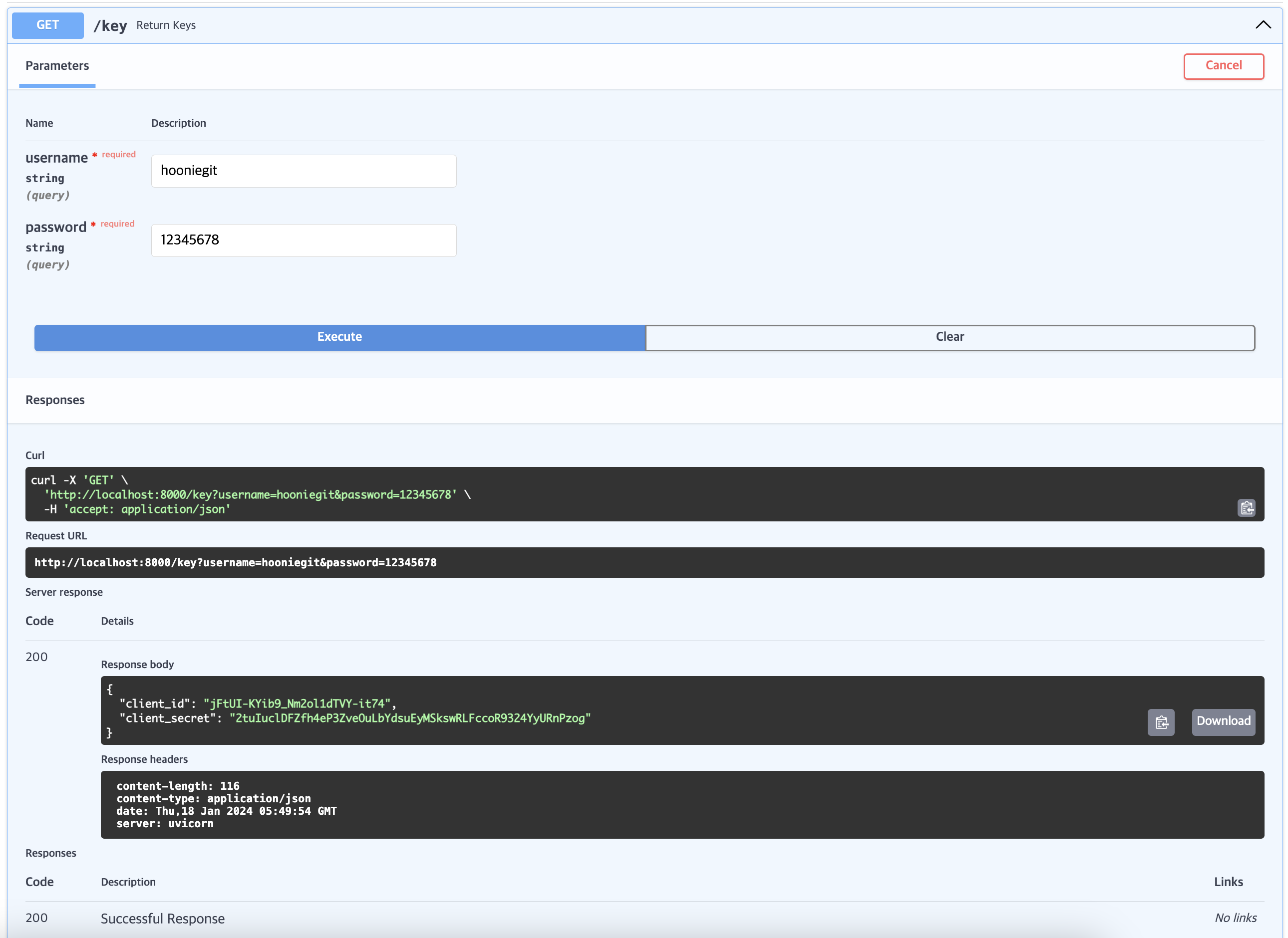 해당 엔드포인트에서는 사용자의 username 및 passowrd 정보를 입력받아 SQLite 데이터베이스에 있는 Client ID 및 Client Secret 정보를 반환하는 역할을 수행합니다. 만일 데이터베이스 검색 결과에 없을 경우 401 ERROR을 발생시킵니다.