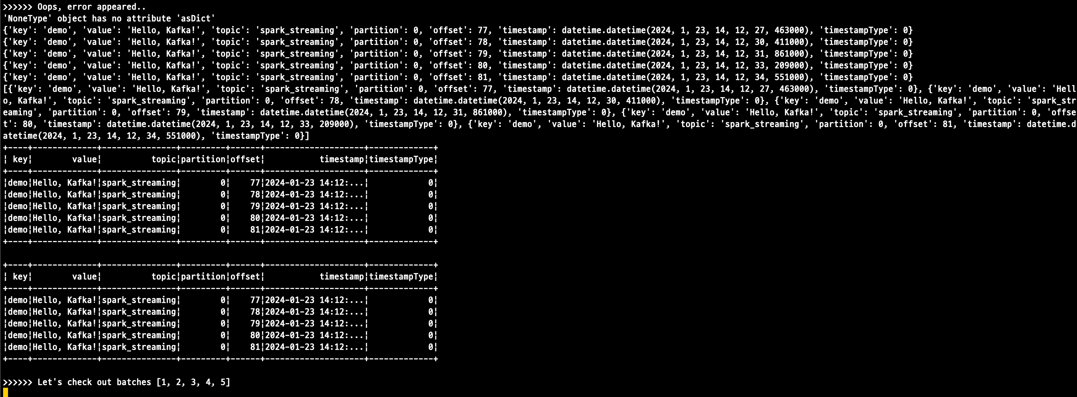 앞서 작성한 스크립트를 실행한 결과입니다. 초기에는 blank batchDF에 대한 예외 처리가 수행되었고, 각 배치를 통해 입력된 데이터가 딕셔너리의 형태로 변환됨을 확인할 수 있습니다. buffer이 지정한 크기에 도달했을 때 데이터프레임이 정상 출력되고, 이를 통해 수행한 작업과 누적된 배치 ID 정보들까지 정상적으로 확인할 수 있습니다.